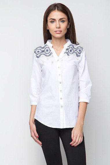 Описаниерубашка с рукавами 3/4. Рубашку украшают кружевные вставки с вышивкой на плечах и по спине. Рукава могут быть укорочены с помощью пуговицы.