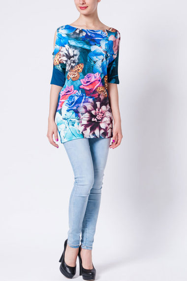 ОписаниеЯркая туника из вискозы с цветочным принтом впереди и однотонной синей спинкой. Модель облегающего покроя, с рукавами 2/4 и большими вырезами на плечах.